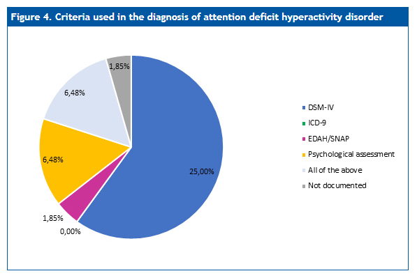 We ought to highlight that the most important way to avoid over- or underdiagnosis of these disorders is to be knowledgeable and make better use of the various diagnostic tools available, keeping in mind that the DSM-IV criteria and scales for the assessment of ADHD (Conners and EDAH) are solely based on pre-established categorical criteria. These are supplementary tools that are not diagnostic by themselves, and therefore should never replace clinical observation in diagnosis. In our study, we found that the diagnosis had been made using a combination of criteria in 64.81% of the patients, and that the DSM-IV criteria were used most frequently, in 25% of cases.