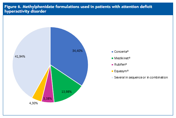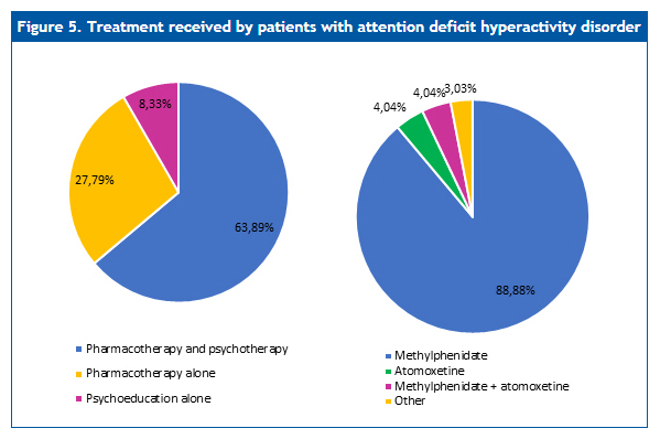 The management of patients could involve pharmacotherapy or other types of treatment, which are reflected in Figure 5, along with the different drugs used. Figure 6 shows the distribution of the different methylphenidate formulations used. Of the patients who received pharmacological treatment, 25.25% experienced side effects, including changes in appetite (40%), sleep disturbances (24%), tics (20%), anxiety (12%) and cardiovascular effects (4%).