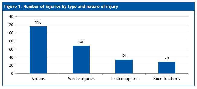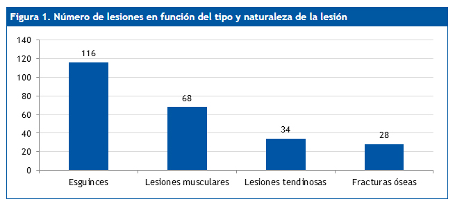 Del total de jugadoras encuestadas, 257 (73,8%) reconocieron haberse lesionado como consecuencia de la práctica de baloncesto durante la temporada 2013-2014. El número de lesiones registradas fue mayor durante los entrenamientos (58,9%). Al analizar el total de lesiones registradas durante la competición (34,8%) se encontró que el 62,8% de las mismas tuvieron lugar cuando las jugadoras actuaron como locales.