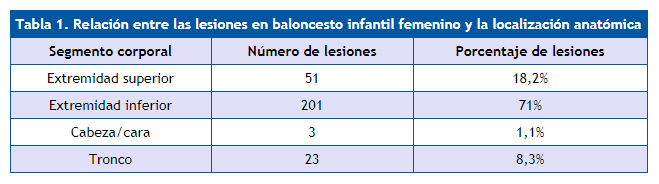 Conclusiones: la práctica de baloncesto por parte de niñas de entre 12 y 13 años presenta un riesgo de lesión que no debe pasar desapercibido, tanto por el promedio de lesiones registrado, como por la posibilidad de que existan recidivas y que la lesión acarree consecuencias a nivel académico.