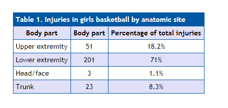 El baloncesto es un deporte que se considera que presenta un elevado índice de lesiones, incluso cuando es practicado por niños y adolescentes5. En el presente estudio se encontró que casi tres cuartas partes de las jugadoras encuestadas se habían lesionado al menos una vez durante la temporada analizada, lo que corrobora esta afirmación.