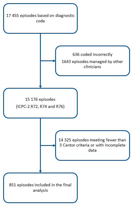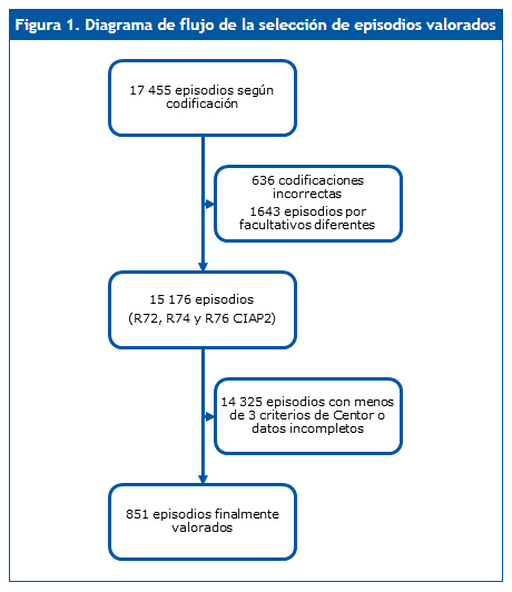 Se recogió información en los diez cupos de los episodios de FA que cumplían 3-4 criterios de Centor durante los años 2012 y 2013. La escala de Centor15 puntúa de 0 a 4 según la presencia de los siguientes criterios: fiebre > 38 °C, exudado amigdalar, adenopatías subangulomandibulares protuyentes y ausencia de tos. El programa de historia clínica informatizada disponible (OMI-AP®) codifica los diagnósticos asociados al episodio en función de la Clasificación Internacional de Atención Primaria (CIAP2)20. Se revisaron todos los diagnósticos atendidos por el pediatra titular de cada grupo de pacientes asignados (faringitis/faringoamigdalitis, amigdalitis, infección respiratoria tracto superior; códigos CIAP2 R72, R76 y R74, respectivamente). Se incluyeron para el análisis posterior los episodios de estos diagnósticos que cumplieran tres o cuatro criterios de Centor, que hubieran sido abordados por el pediatra titular de ese cupo y que no pertenecieran a pacientes con alguna patología de base o tratamiento inmunosupresor que condicionase un manejo diferente de la FA. Quedaron excluidos los episodios en los que se justificó la no realización de test diagnóstico (imposibilidad de toma de muestra, tratamiento antibiótico reciente y cardiopatía). Asimismo, se recogieron los diagnósticos registrados en el mes siguiente, que pudieran ser considerados como complicación infecciosa por la ausencia de tratamiento, y los potencialmente secundarios al tratamiento.