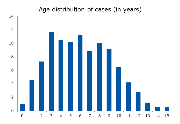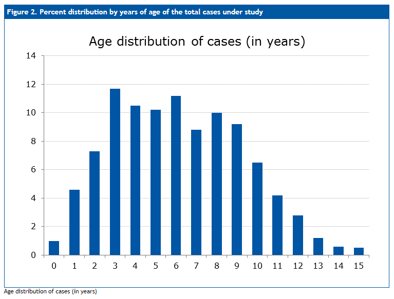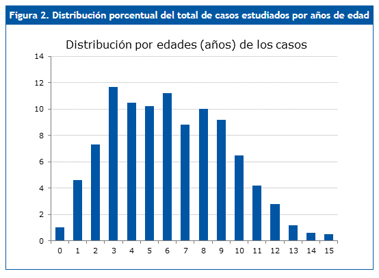 La Fig. 2 muestra la distribución de casos por edades (distribución no normal, test de Kolmogorov-Smirnov: distribución máxima de 0,053; p = 0,017). La mediana de la edad fue de 6,38 años y el rango intercuartílico 4,08 a 8,99 años. Hubo casos desde diez meses de edad a 15 años y 11 meses. El 48% de episodios fueron en mujeres y 52% en varones.
