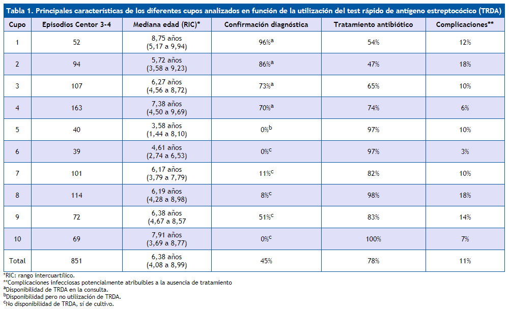 | Cupo | Episodios Centor 3-4 | Mediana edad (RIC) | Confirmación diagnóstica | Tratamiento antibiótico | Complicaciones* |