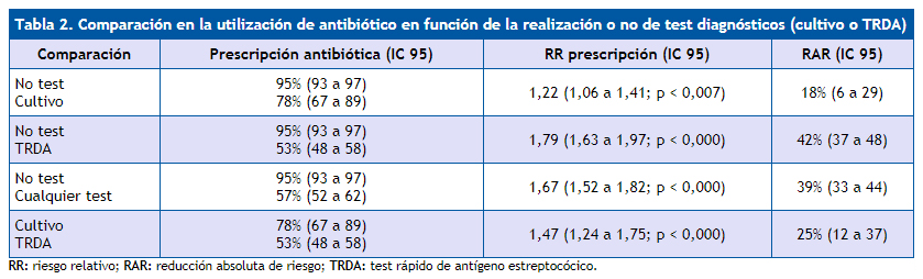 En la Tabla 2 se analizan los porcentajes de prescripción de antibióticos en función de que se realizara algún test diagnóstico, en forma de RR y RAR para cada comparación. Para el total de episodios, la mayor reducción en la prescripción se dio con la utilización de TRDA (RR si no se utilizó test frente a su uso: 1,79 [IC 95: 1,63 a 1,97]; p < 0,000), lo que supone una reducción absoluta de prescripción antibiótica cuando se utiliza el test frente a su no utilización de un 42% (IC 95: 37 a 48). La utilización del cultivo también supuso una reducción significativa en la utilización de antibióticos: RAR del 18% (IC 95: 6 a 29).