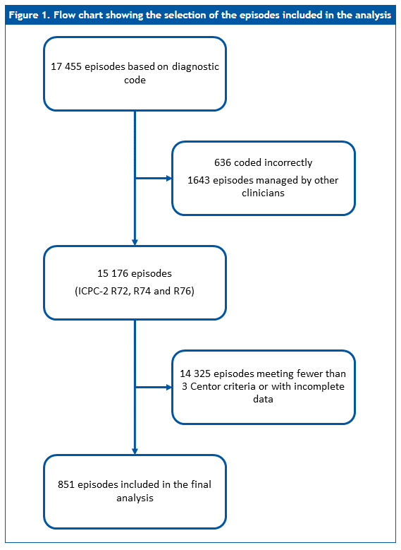 Variables principales fueron la prescripción o no de antibioterapia y la presencia o no de complicaciones en el mes siguiente del inicio del episodio valorado. Variables secundarias fueron: sexo, edad, población rural o urbana, test diagnóstico, presencia o ausencia de cada uno de los criterios de Centor, puntuación de Centor, y antibiótico prescrito.