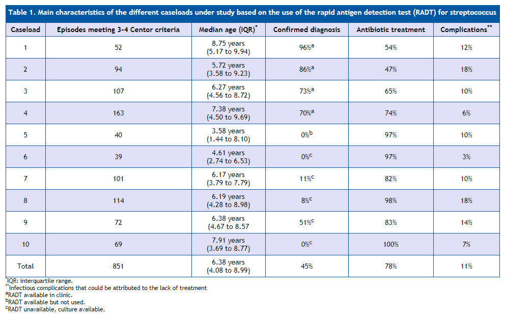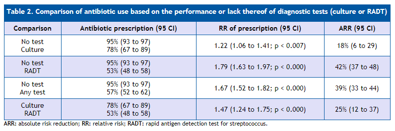 Resultados: de 17 455 episodios registrados, se seleccionaron 851 que cumplían los criterios de inclusión (tres o cuatro criterios de Centor). En los episodios en los que se realizaron test rápidos de detección de antígeno, la reducción en la prescripción antibiótica fue del 42% (reducción absoluta de riesgo: 42%; intervalo de confianza del 95% [IC 95]: 37 a 48; p < 0,001). Comparando el abordaje entre los pediatras que disponían y utilizaban el test (4), con los que no (6), la reducción absoluta de riesgo fue del 29% (IC 95: 24 a 34; p < 0,001). Se presentaron complicaciones infecciosas en el 12% de los tratados y en el 8% de los no tratados (riesgo relativo: 1,49; IC 95: 0,88 a 2,52; p = 0,178). Se prescribió significativamente más penicilina V que amoxicilina cuando se realizó test diagnóstico (riesgo relativo: 1,30; IC 95: 1,10 a 1,55; p = 0,004).