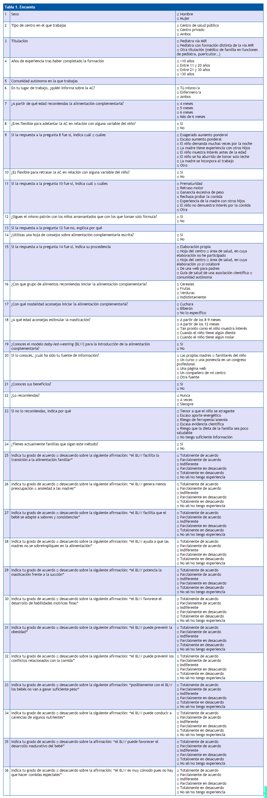 | 19 | ¿Conoces el modelo baby-led-weaning (BLW) para la introducción de la alimentación complementaria? | □ Sí □ No |