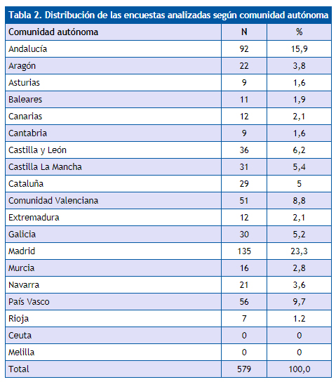 | Tabla 2. Distribución de las encuestas analizadas según comunidad autónoma | ||