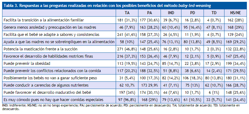 En torno al 20-35% no tienen experiencia o una posición clara en relación con los ítems preguntados sobre posibles beneficios del BLW (Tabla 3).