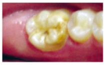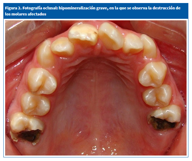 | Figura 2. Fotografía oclusal: hipomineralización grave, en la que se observa la destrucción de los molares afectados |