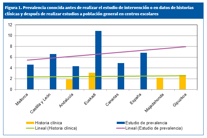 | Figura 1. Prevalencia conocida antes de realizar el estudio de intervención o en datos de historias clínicas y después de realizar estudios a población general en centros escolares |