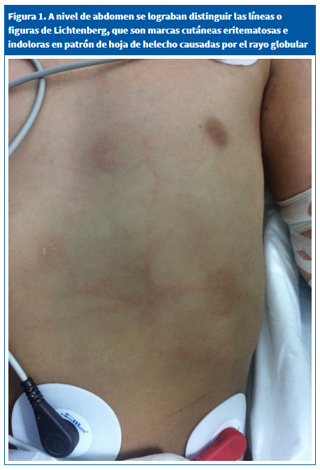 A su ingreso, en la exploración física inicial, se encontró al paciente con vía aérea permeable, sin datos de dificultad respiratoria, ruidos cardiacos rítmicos de buen tono e intensidad, pulsos periféricos simétricos y con Glasgow 13/1310. En el abdomen se visualizaba una quemadura de primer grado con presencia de líneas o figuras de Lichtenberg. Los estudios analíticos (creatinofosfocinasa [CPK] y CPK-MB, química sanguínea, biometría hemática, electrolitos séricos y pruebas de funcionamiento hepático) estaban en rangos normales. Por ultrasonido se obtuvo una fracción de eyección intermedia (FEVI) del 92% y una vena cava de 0,53 cm en modo estático. Debido a la evolución favorable del paciente junto con la resolución completa de la lesión, se decidió su egreso hospitalario el día 3 de julio de 2017.