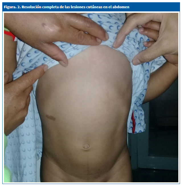 Después de cuatro días de estancia hospitalaria la lesión abdominal desapareció casi por completo (Fig. 2), además, el paciente continuó estable y sin alteraciones neurológicas ni cardiacas, por lo que se decidió el egreso de esta unidad hospitalaria con posterior seguimiento en la consulta externa por parte de los servicios de esta unidad.