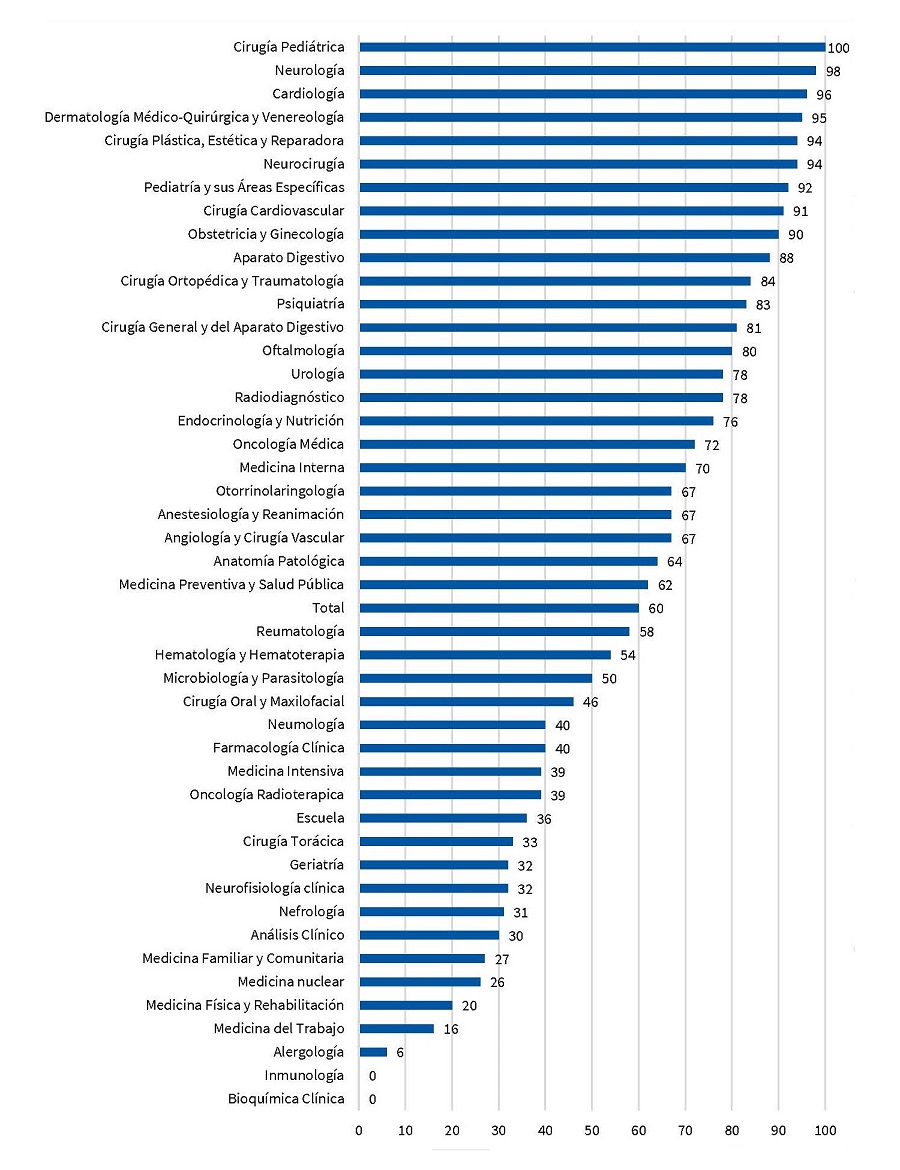 Según el informe descriptivo de la encuesta MIR R1 20146, se considera “éxito del sistema de adjudicación” al porcentaje de individuos que han podido elegir su especialidad preferida. Para ello, se plantean qué especialidad y centro hubieran elegido de no tener ninguna restricción de nota, es decir, como si eligieran con todas las plazas y centros disponibles. En el caso de la Pediatría, la tasa de éxito es del 92%, y se encuentra un déficit de plazas de forma que hubiese sido elegida en mayor proporción si hubiera plazas disponibles, la séptima de todas las especialidades (Fig. 2).