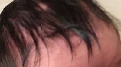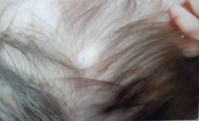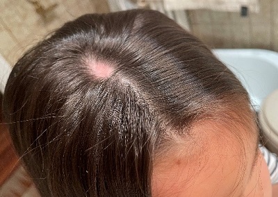 A los 2 meses de vida es valorada en Dermatología, a la tricoscopia parece apreciarse leve signo del collarín. Realizan ecografía de la lesión cutánea y cerebral sin hallazgos, se plantean como diagnósticos ACC y alopecias cicatriciales primarias (ACP). A los 6 meses, presenta repoblación de folículos pilosos, por lo que es dada de alta.