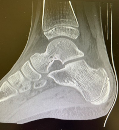 En la exploración física se objetiva dolor a la presión en zona anterior de maléolo interno sin edema ni eritema. Ante la persistencia del dolor se deriva a atención hospitalaria donde se descarta patología reumatológica e infecciosa mediante estudio analítico (no aumento de reactantes de fase aguda, anticuerpos antinucleares negativos), radiografía de tobillo en la que no se observan alteraciones de la densidad ósea ni reacción perióstica y ecografía de tobillo sin derrame articular ni alteraciones tendinosas ni ligamentosas.