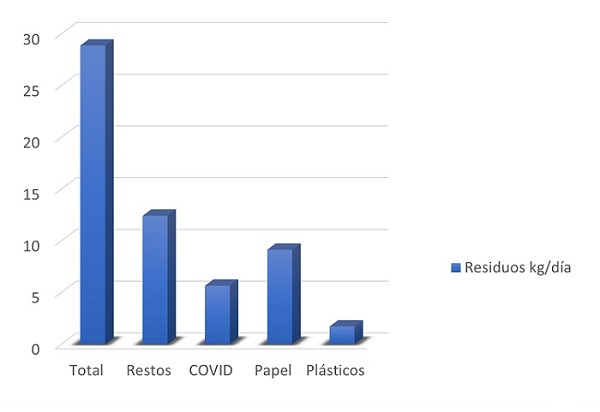 Los residuos totales fueron de 29 kg/día. De ellos, 9 kg/día (31%) de papel, 2 kg/día (6%) de plástico, 12 kg/día (60%) restos y 5,6 kg/día de restos zona COVID.
