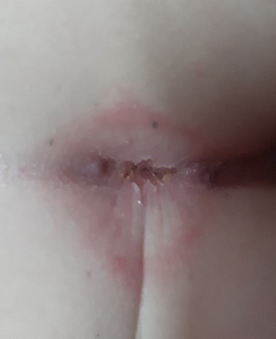 Niño de 5 años que consulta por dolor y enrojecimiento perianal desde hace 2 días, especialmente nocturno, asociado a disquecia (Fig. 1). Los días previos refiere aumento en la consistencia de las deposiciones que ya se ha normalizado. En la exploración presenta fisura anal en posición 12 y eritema perianal, streptotest positivo y se pauta mupirocina tópica y amoxicilina a 50 mg/kg/día en 3 tomas durante 10 días con resolución del proceso.
