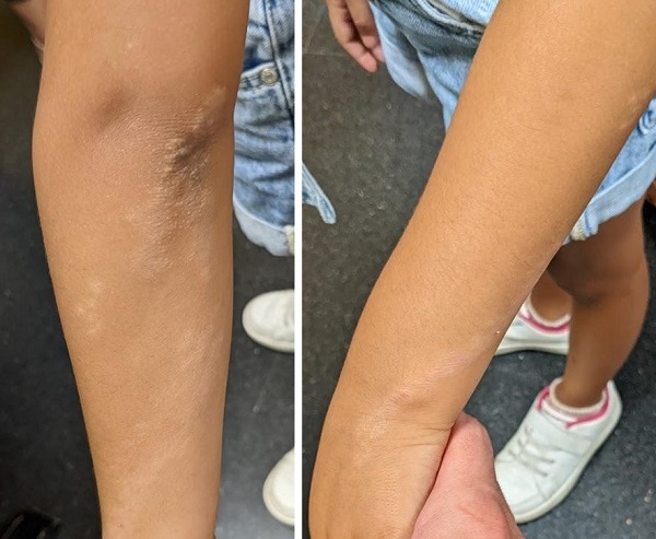 Se inició prueba terapéutica con corticoide tópico sin mejoría a las dos semanas; ante la sospecha de liquen estriado se comenta con consulta de Dermatología Infantil que valora a la paciente y coincide en la sospecha diagnóstica. Se explica a la familia la evolución esperable con resolución y pigmentación espontáneas en los próximos meses.